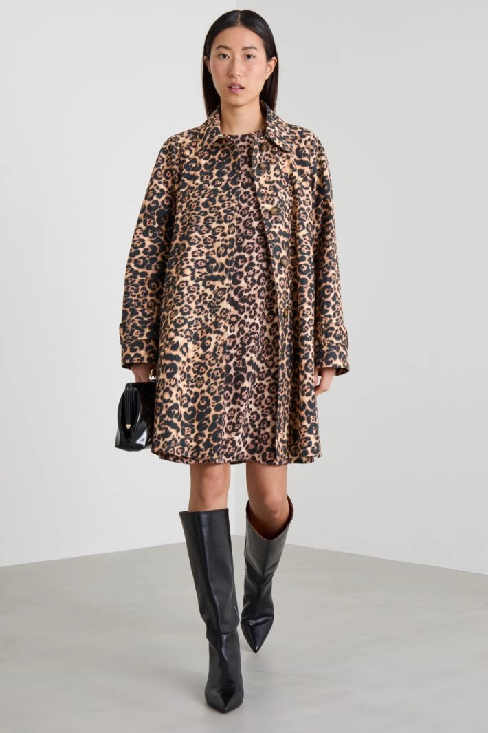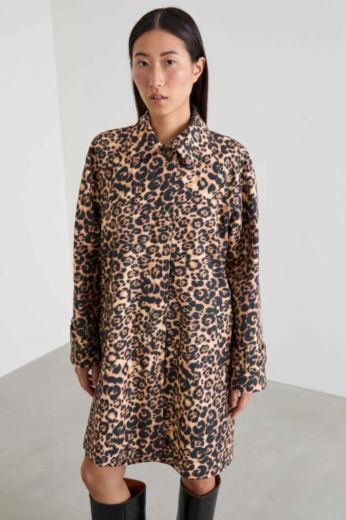 Straight-cut trench coat in heavy pure cotton canvas with an animal print, a shirt collar, long raglan sleeves with a cuff strap, side welt pockets and a single-breasted fastening hidden by buttons. Lined.