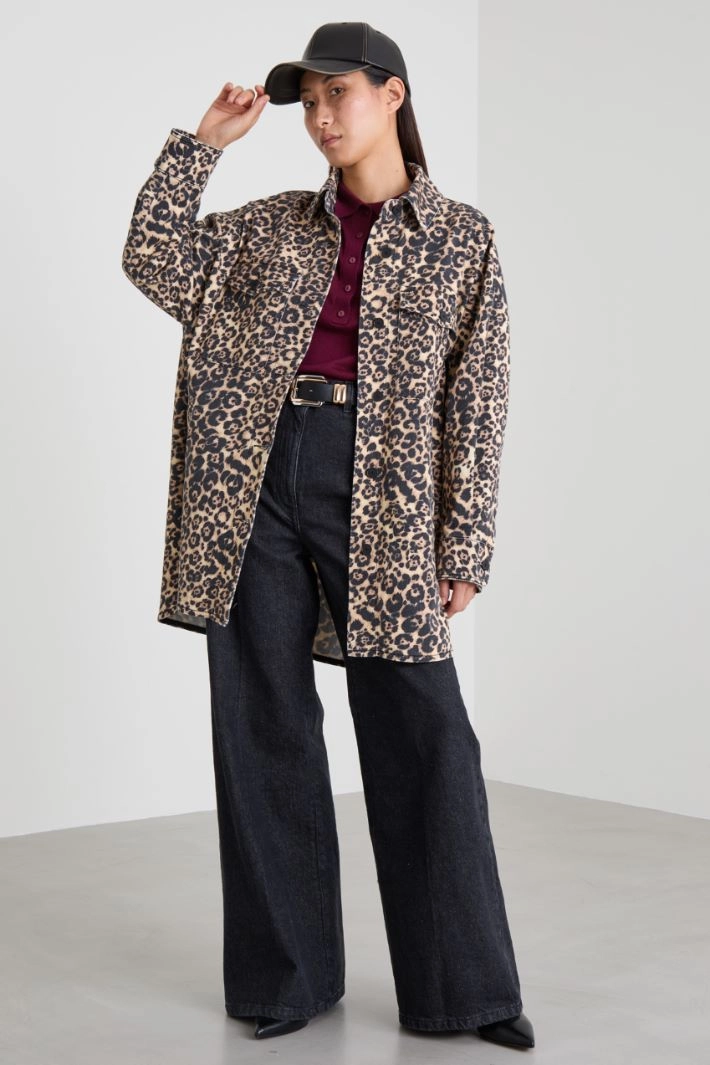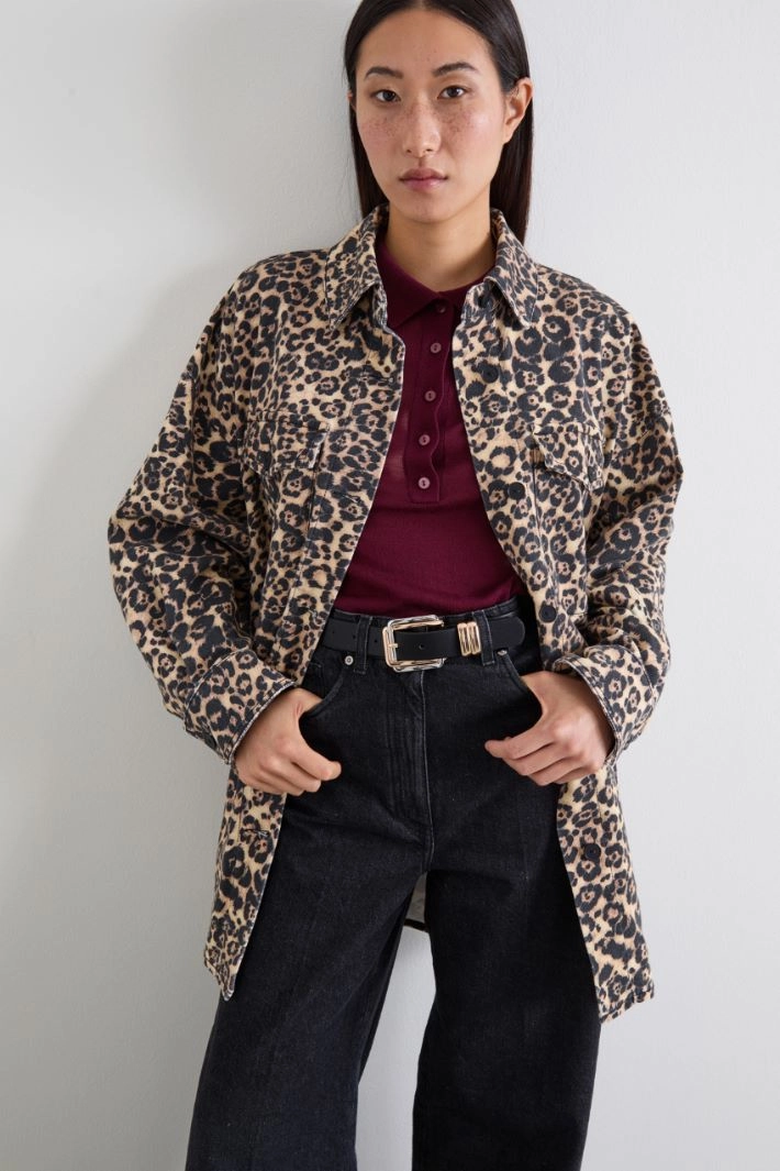 Straight-cut trench coat in stretch cotton denim with an animal print, featuring a classic collar, long dropped-waist sleeves with cuffs and buttons, patch pockets with flaps on the chest and side welt pockets. Side slits and fastening with visible buttons. Unlined.