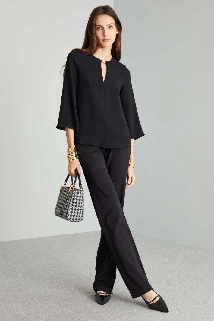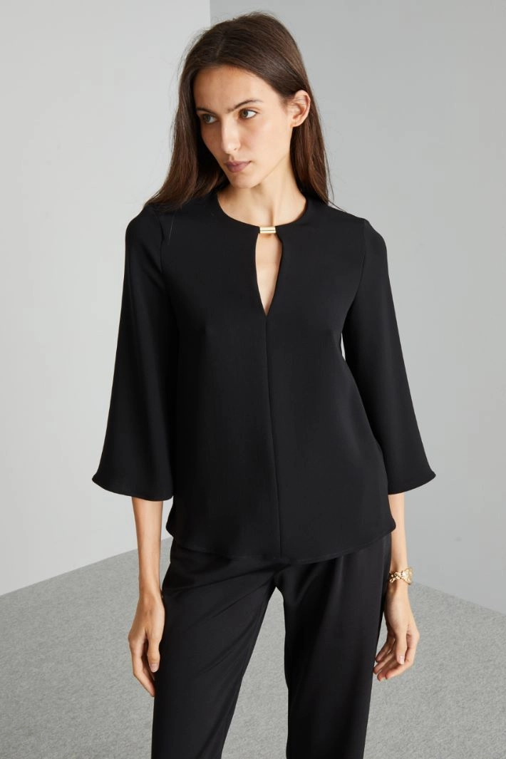 Fluid cady blouse with a crew neckline finished with a metal loop, keyhole opening on the front and back, three-quarter sleeves and button fastening.