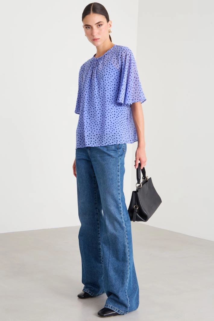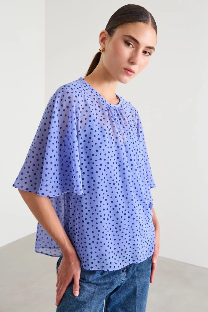 Flowing blouse in printed georgette, with round neckline, short sleeves and teardrop fastening with button on the back. Matching scarf and slip top.