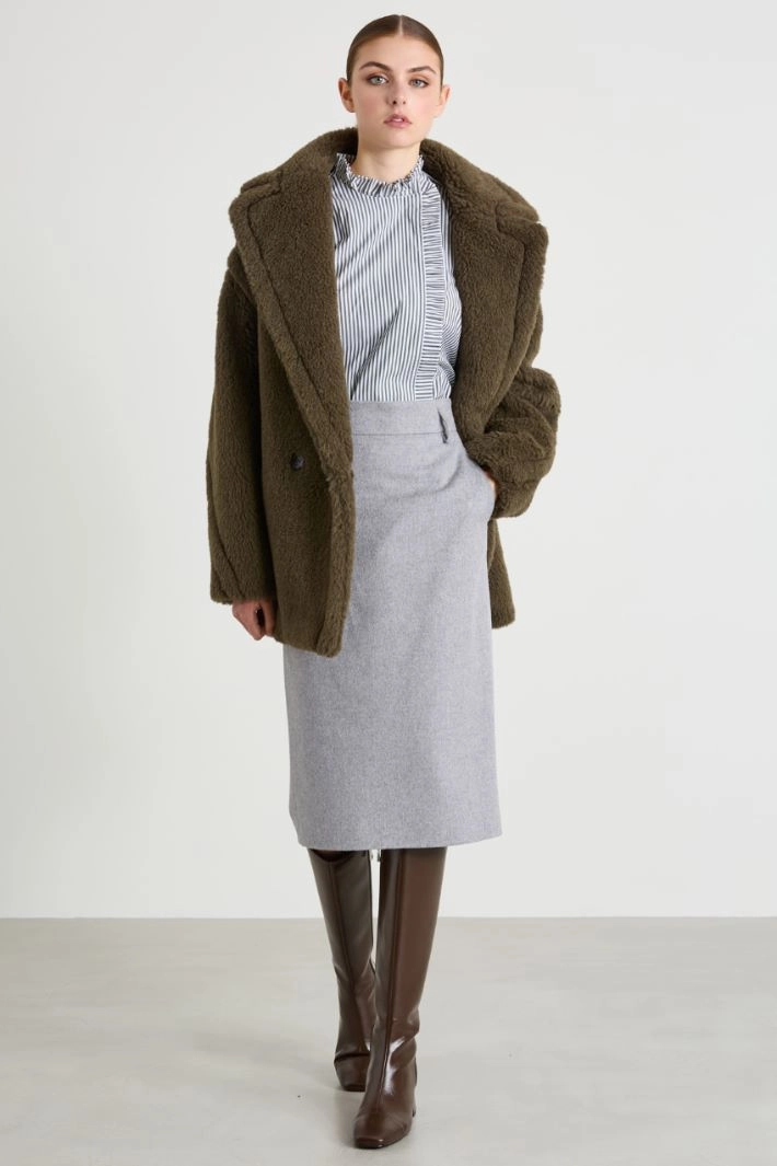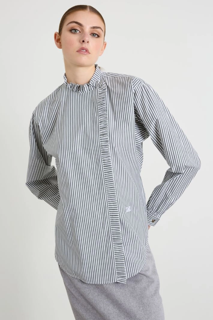 Straight-cut shirt in pure yarn-dyed cotton poplin, with ruffled detail on the edges, long sleeves with cuff and yoke-cut button with counter pleat on the back and asymmetrical fastening hidden by buttons.