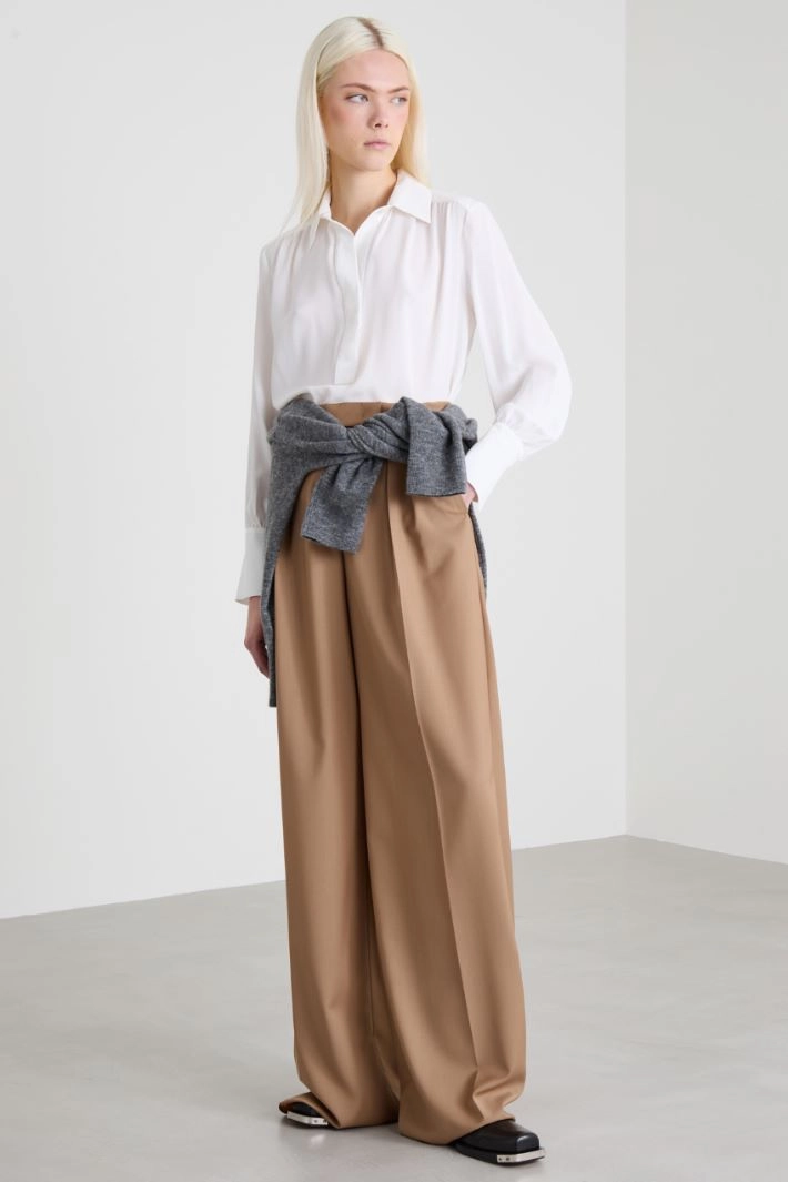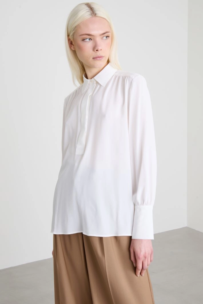 Flowing blouse in silk blend crepe de chine, with shirt collar, long sleeves with cuffs and buttons, yoke cut with gathering at the back and hidden fastening with buttons at the front.