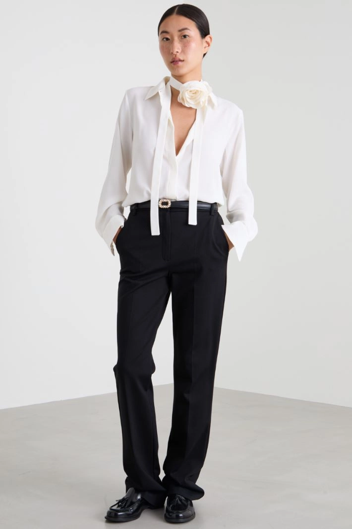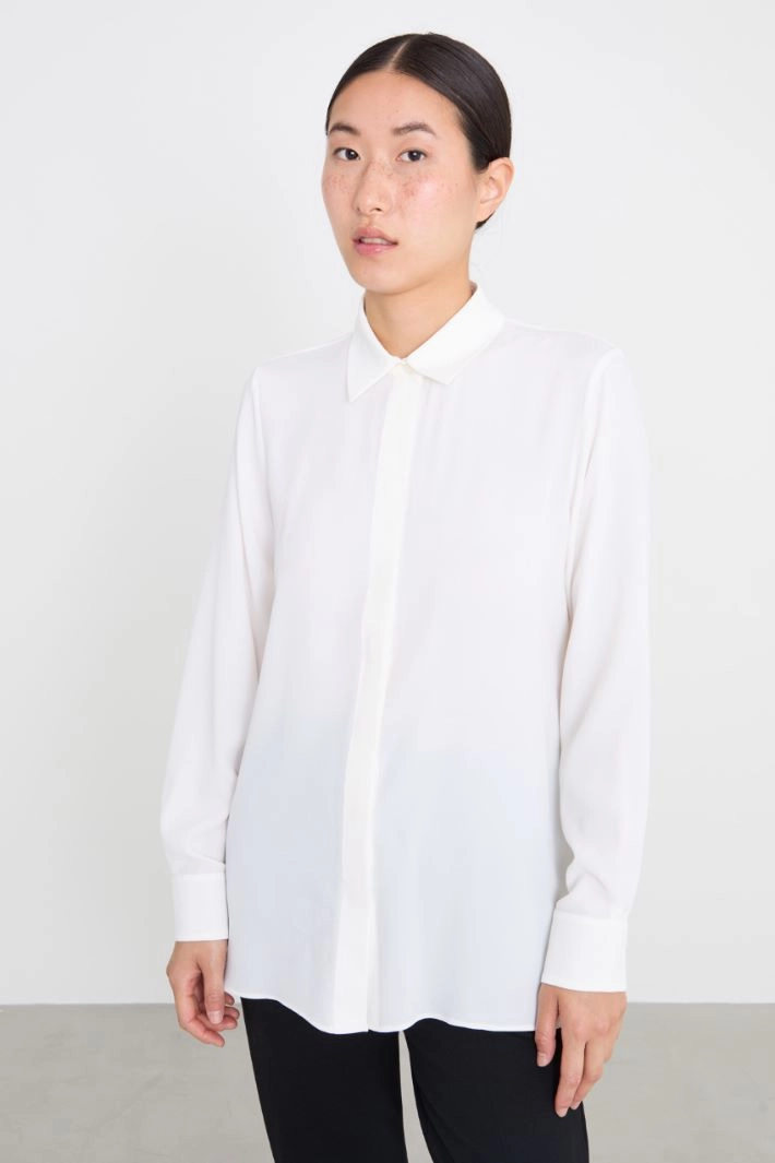 Flowing shirt in silk blend crepe de chine, classic collar, long sleeves with cuffs and buttons, yoke on the back and hidden fastening with buttons. Accessory with matching flower.