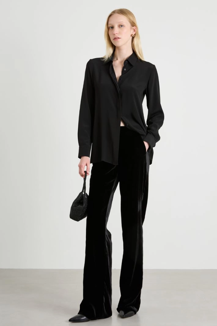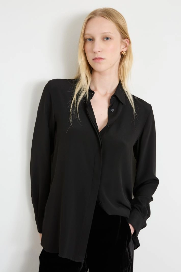 Flowing shirt in silk blend crepe de chine, classic collar, long sleeves with cuffs and buttons, yoke on the back and hidden fastening with buttons. Accessory with matching flower.