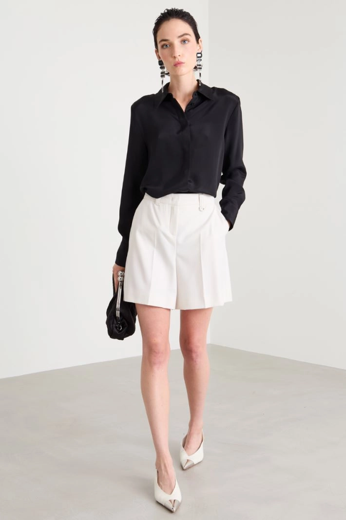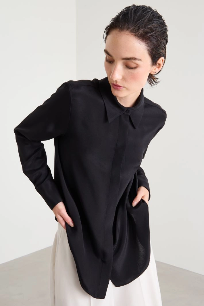Camisa de corte recto de crepé de china de pura seda, con cuello clásico, mangas largas pegadas con puño alto y doble botón joya. Bajo redondeado con aberturas laterales. Cierre con botones ocultos.