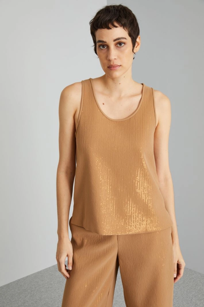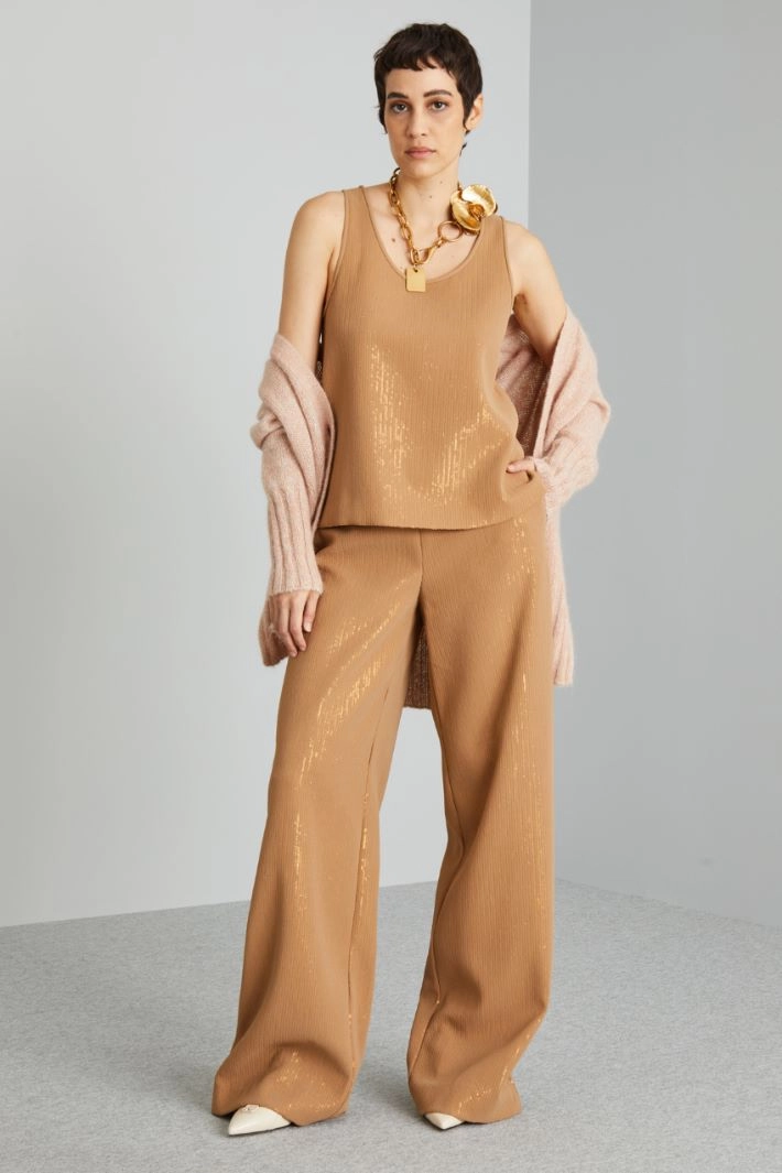 Straight-cut sleeveless in georgette with a layer of embroidered sequins underneath, thick straps, U-neck, side slits and zip fastening on the back. Lined.
