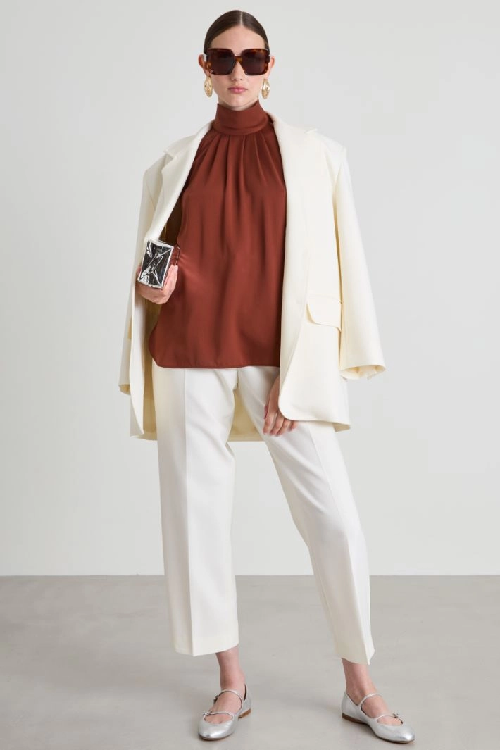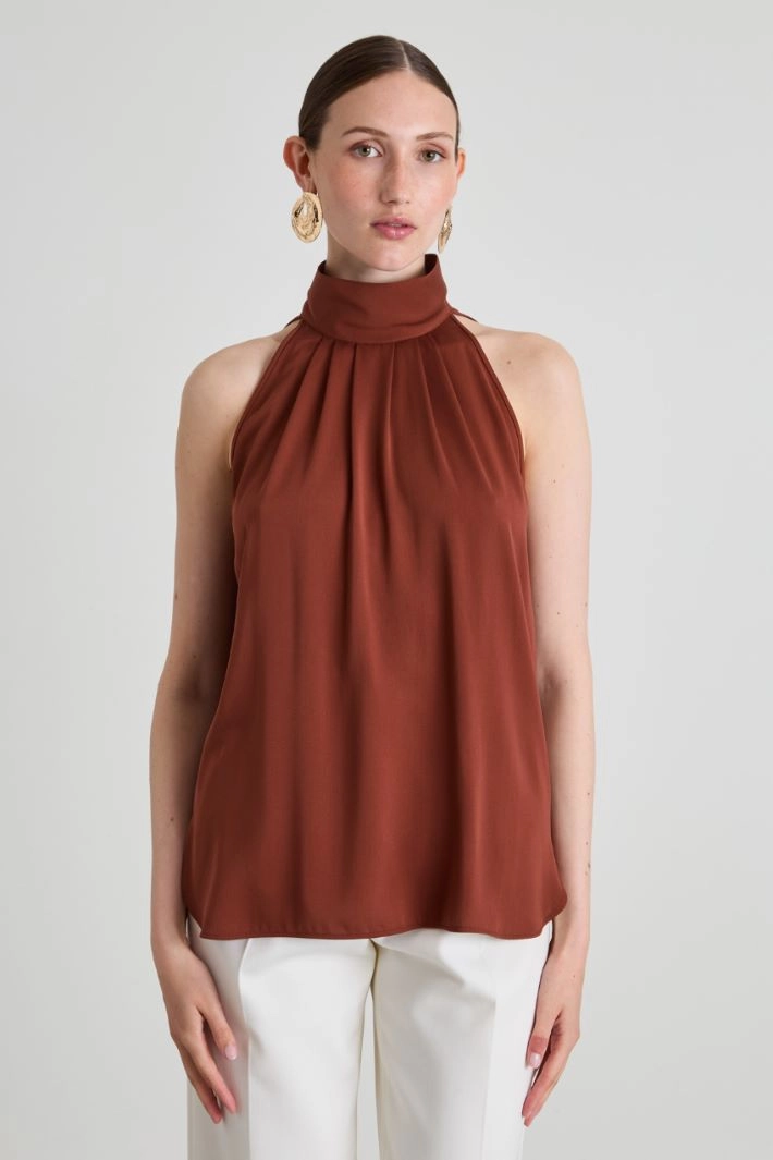 Flowing halter top in pure silk fabric, with a high neckline finished with a pleated motif, sleeveless and side slits at the bottom. Teardrop fastening with covered buttons on the back.