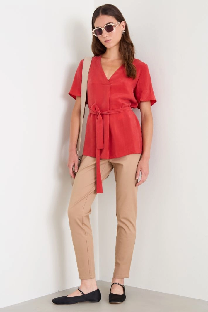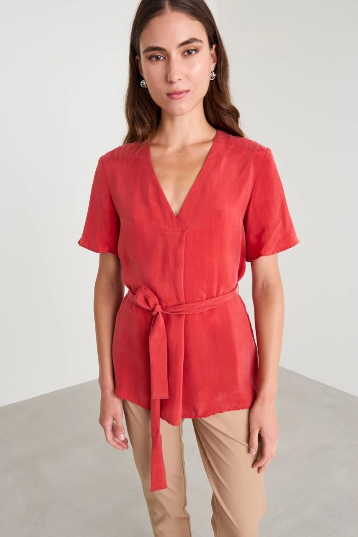 Flowing blouse in pure natural fibre fabric, with V-neck, short sleeves and pleat motif on the front, matching sash.