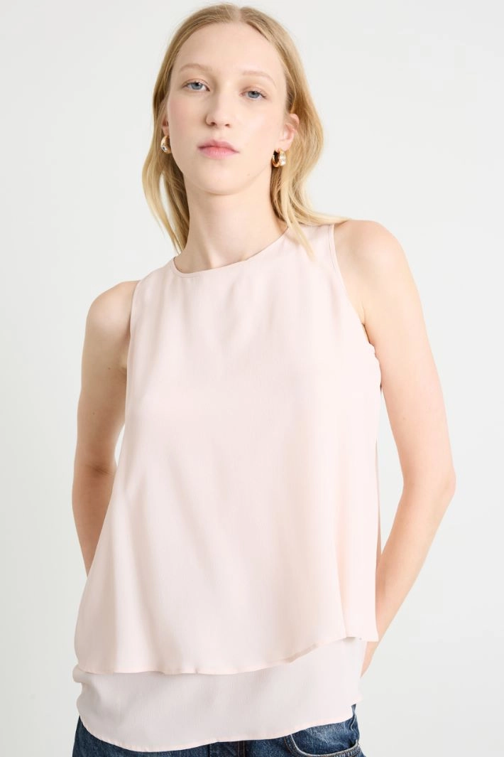 Slightly flared top in double-layered crepe de chine, with a boat neckline and teardrop fastening with button.