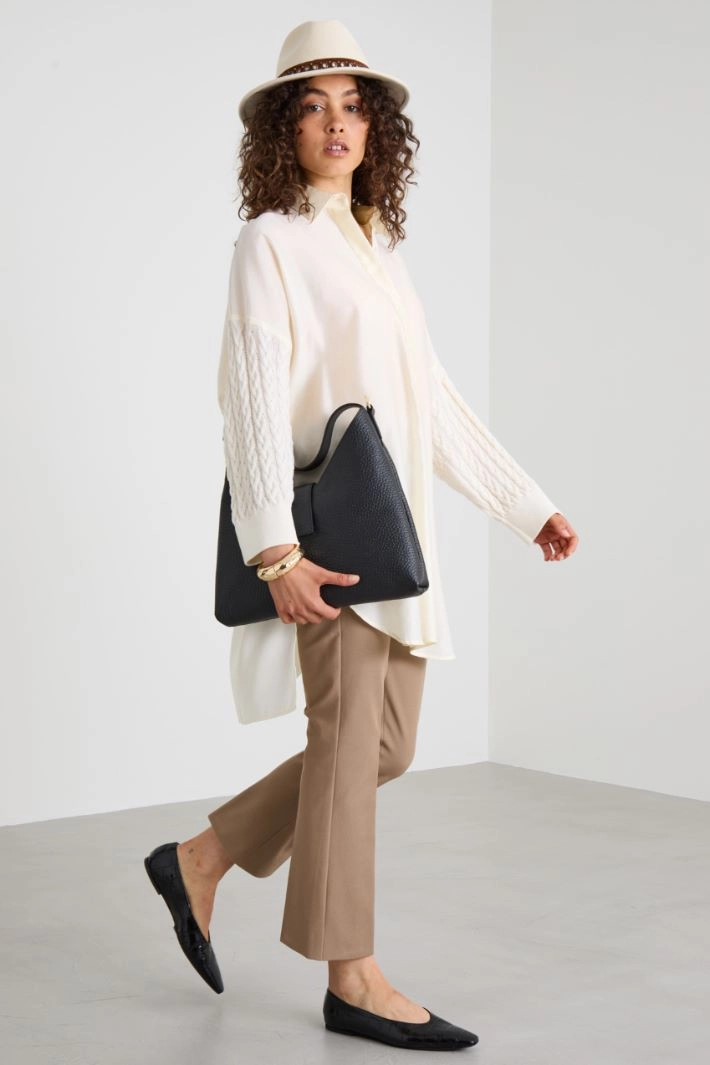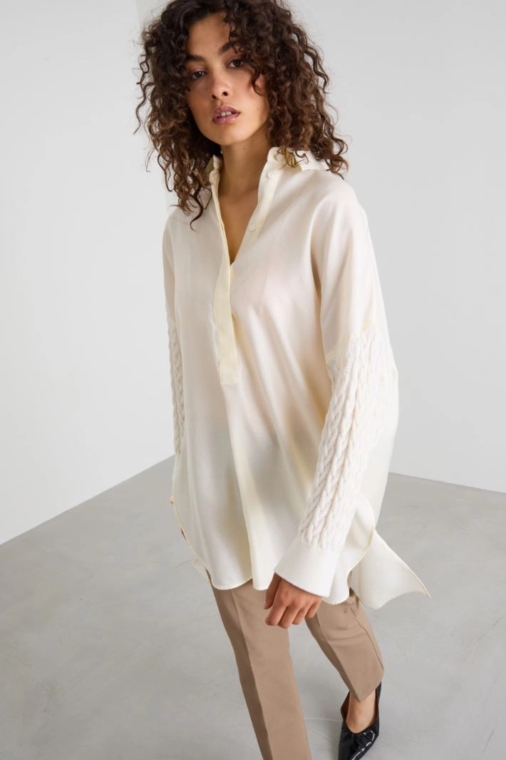Oversized straight-cut shirt in pure cotton canvas, with classic collar, long sleeves with dropped shoulders in knit and asymmetrical hem longer on the back and side slits. Hidden button fastening.