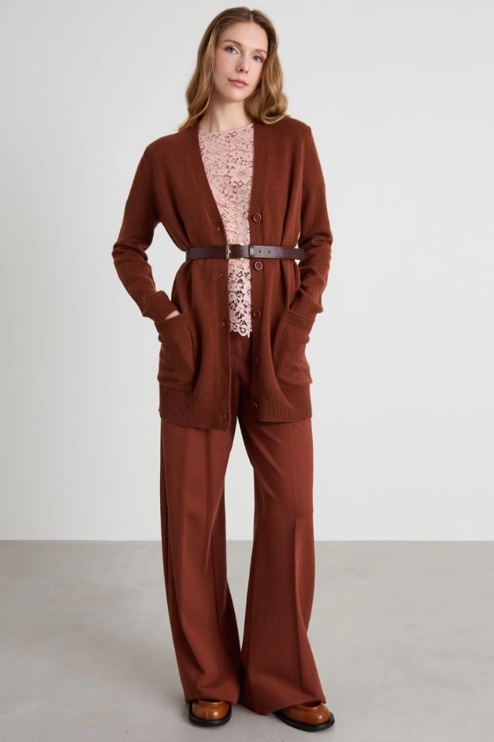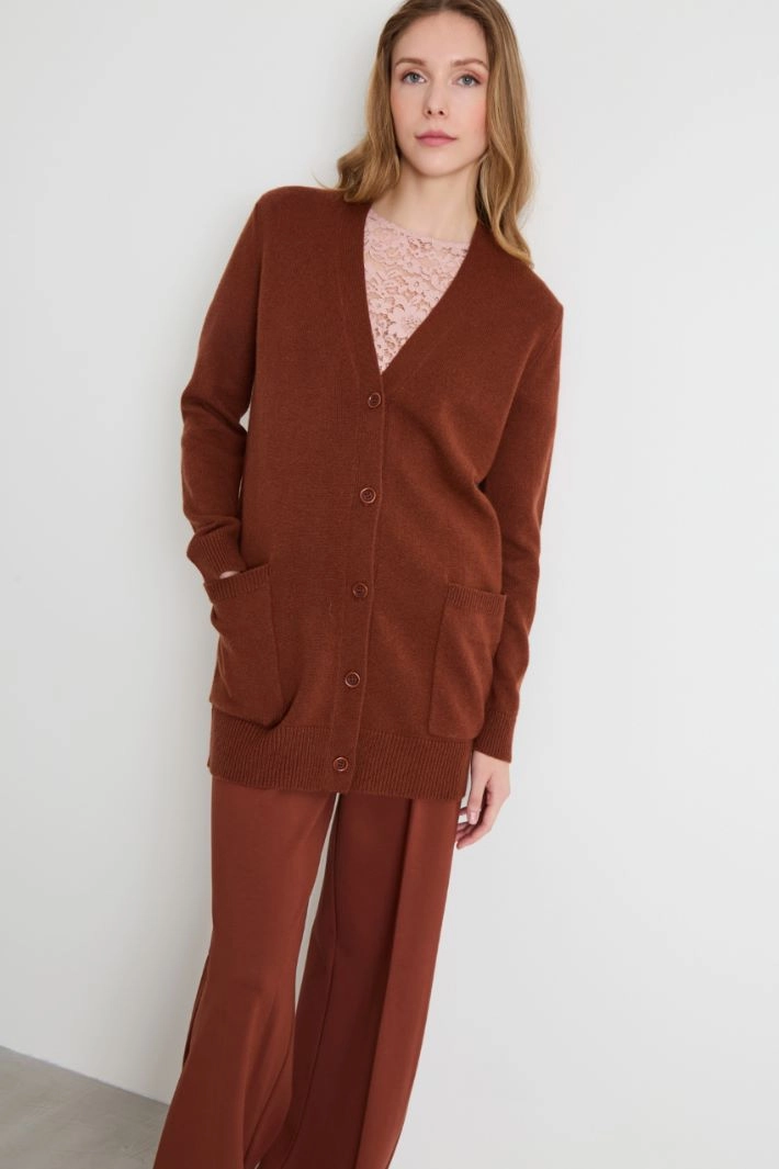 Regular-fit long cardigan in wool and cashmere yarn, with embroidered sequin motif on the back, V-neck, long sleeves, side patch pockets and ribbed trim. Fastening with visible buttons.