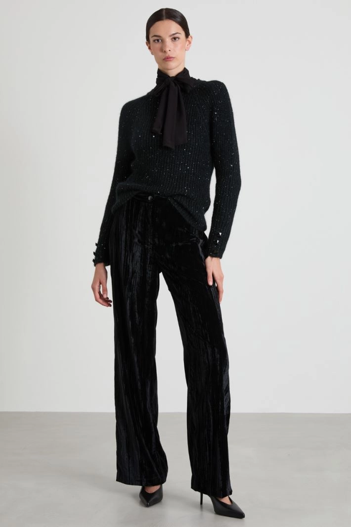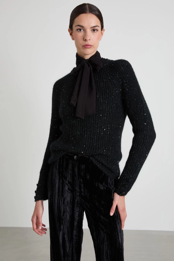 Regular-fit sweater in yarn blended micro sequins, crew neck and raglan sleeves embellished with jewel buttons at the cuffs.