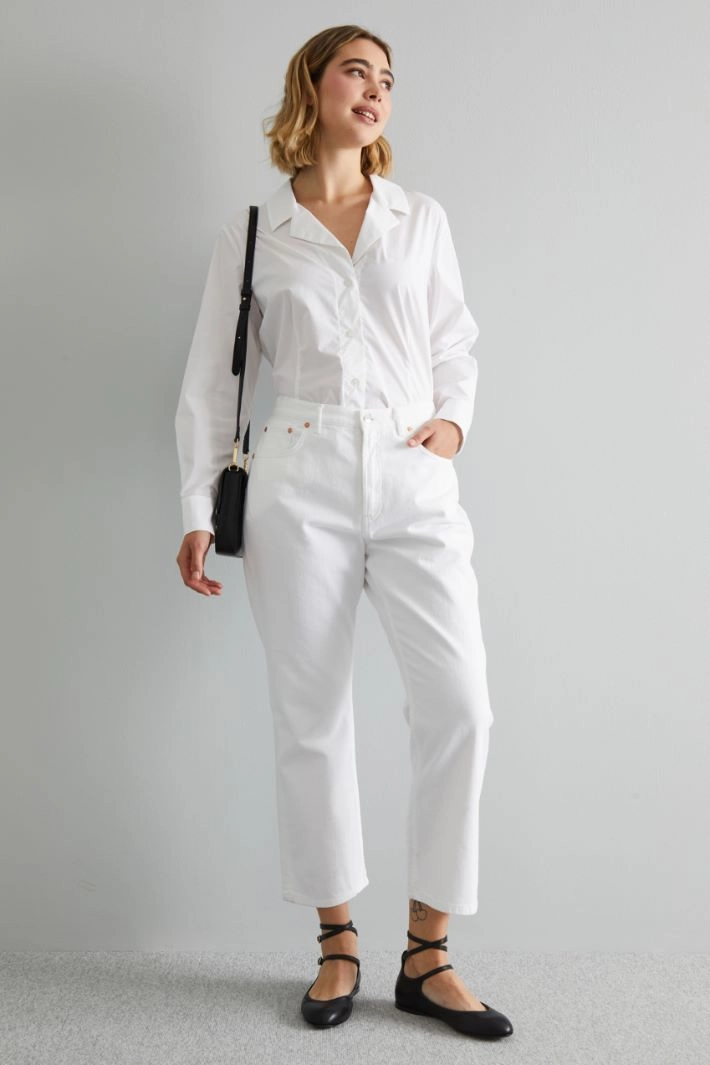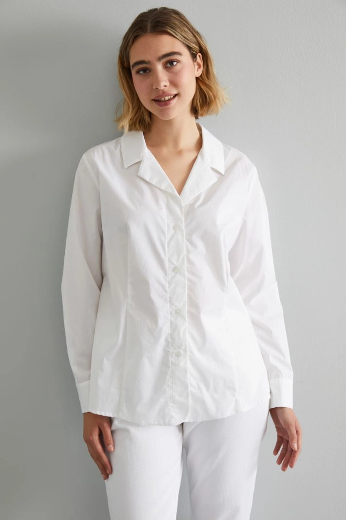 Slightly tailored shirt in pure cotton poplin, with lapel collar, long sleeves with cuff and buttons. Button fastening.