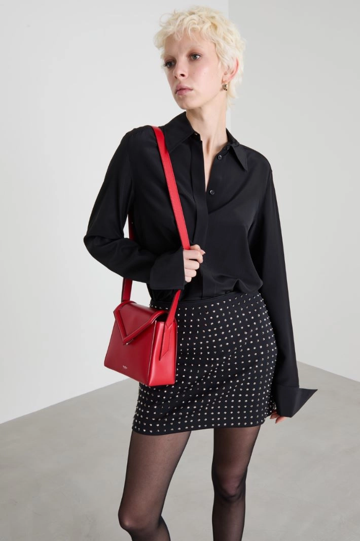 Flowing shirt in pure silk crepe de chine with classic collar, long sleeves with turned-up cuffs and buttons, and a yoke with a box pleat on the back. Hidden button fastening.