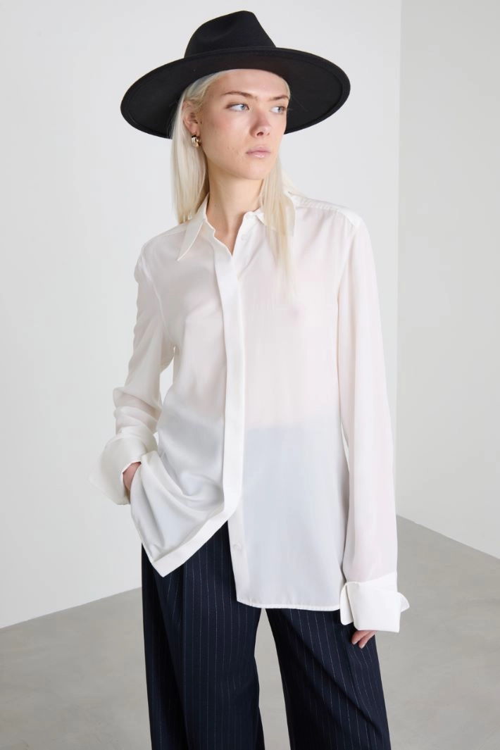 Flowing shirt in pure silk crepe de chine with classic collar, long sleeves with turned-up cuffs and buttons, and a yoke with a box pleat on the back. Hidden button fastening.