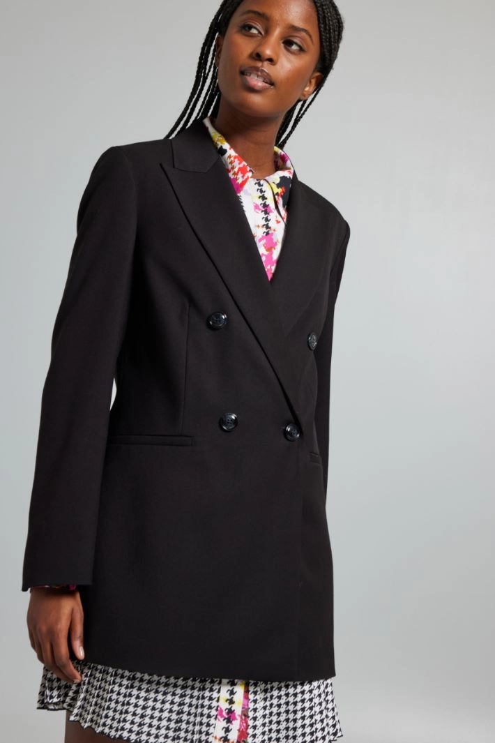 Slim-fit blazer in stretch viscose blend gabardine, with peak lapel collar, long sleeves with slit at the bottom, welt pockets and slit at the back. Double-breasted button fastening. Lined.