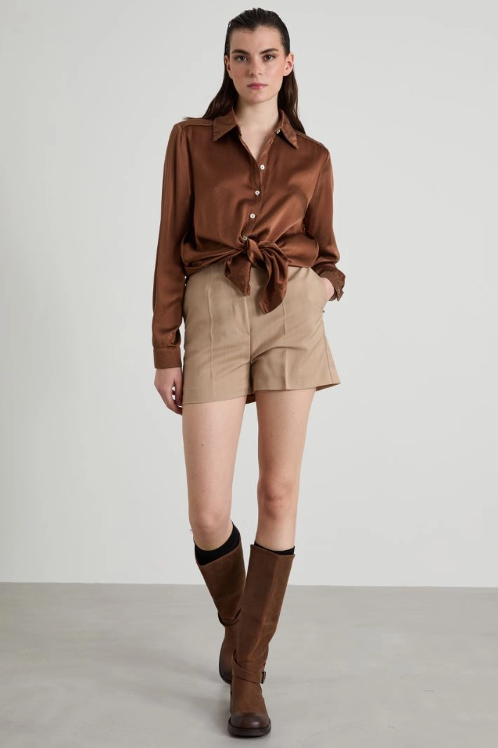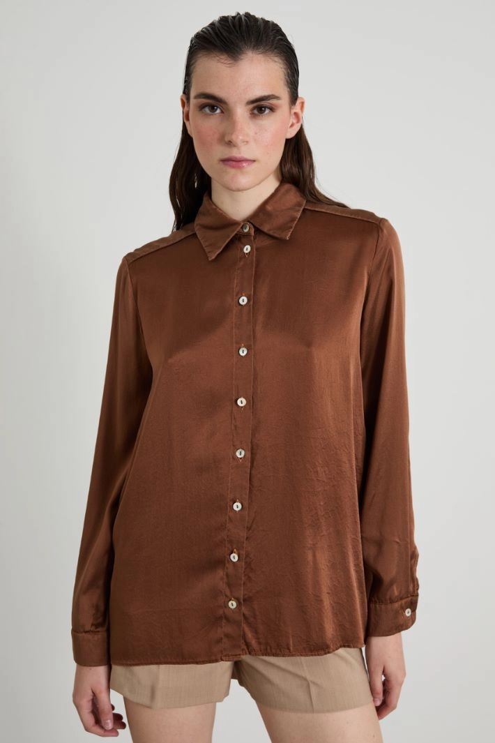 Flowing shirt in pure silk satin, with classic collar, long sleeves with cuff and button, yoke cut with counter pleat on the back and side slits with visible button fastening.