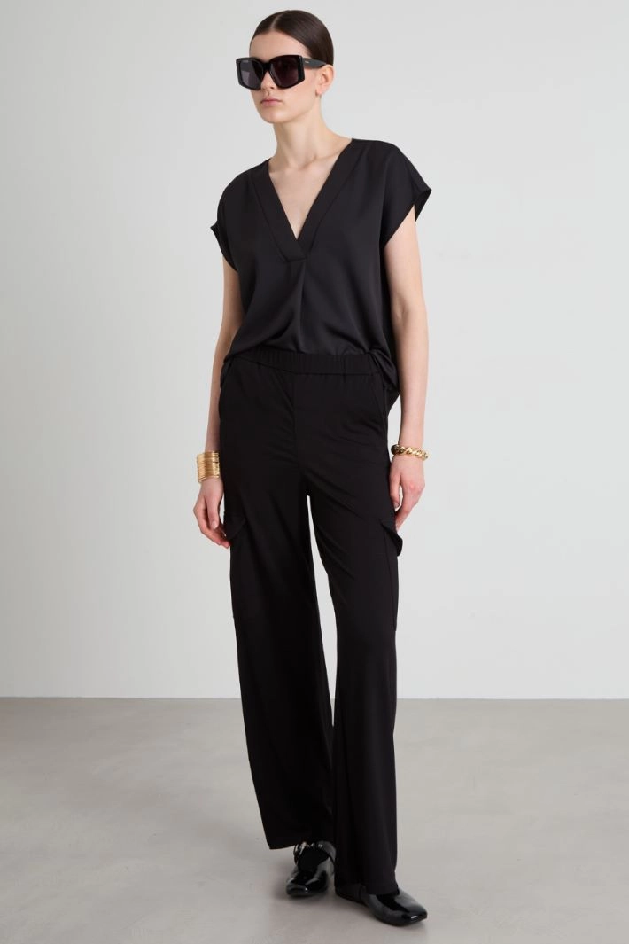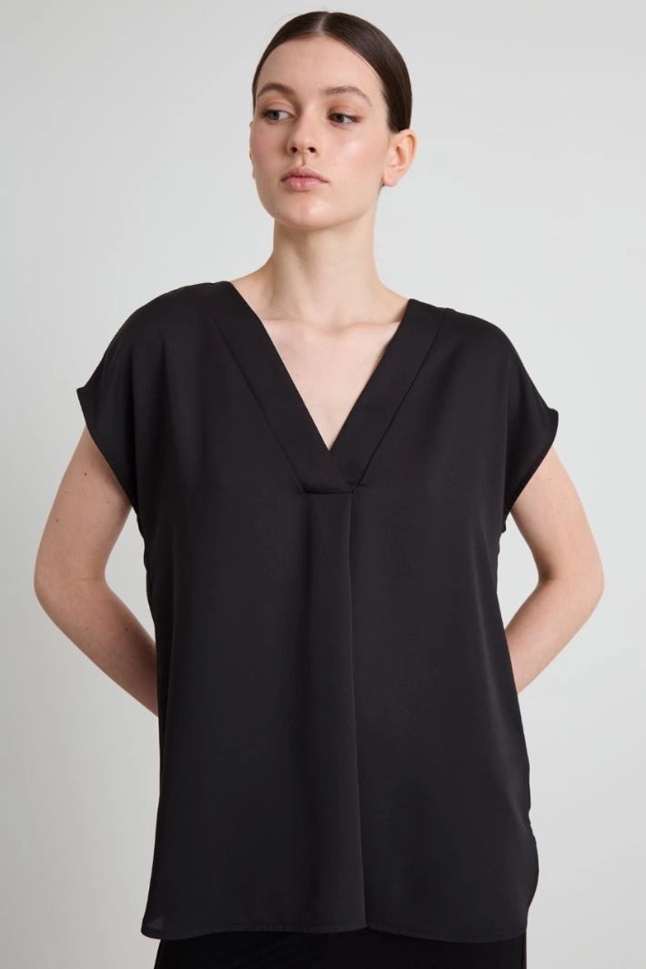 Flowing envers satin blouse with a shiny finish, with a V-neck, short cap sleeves and a folded pleat on the front.