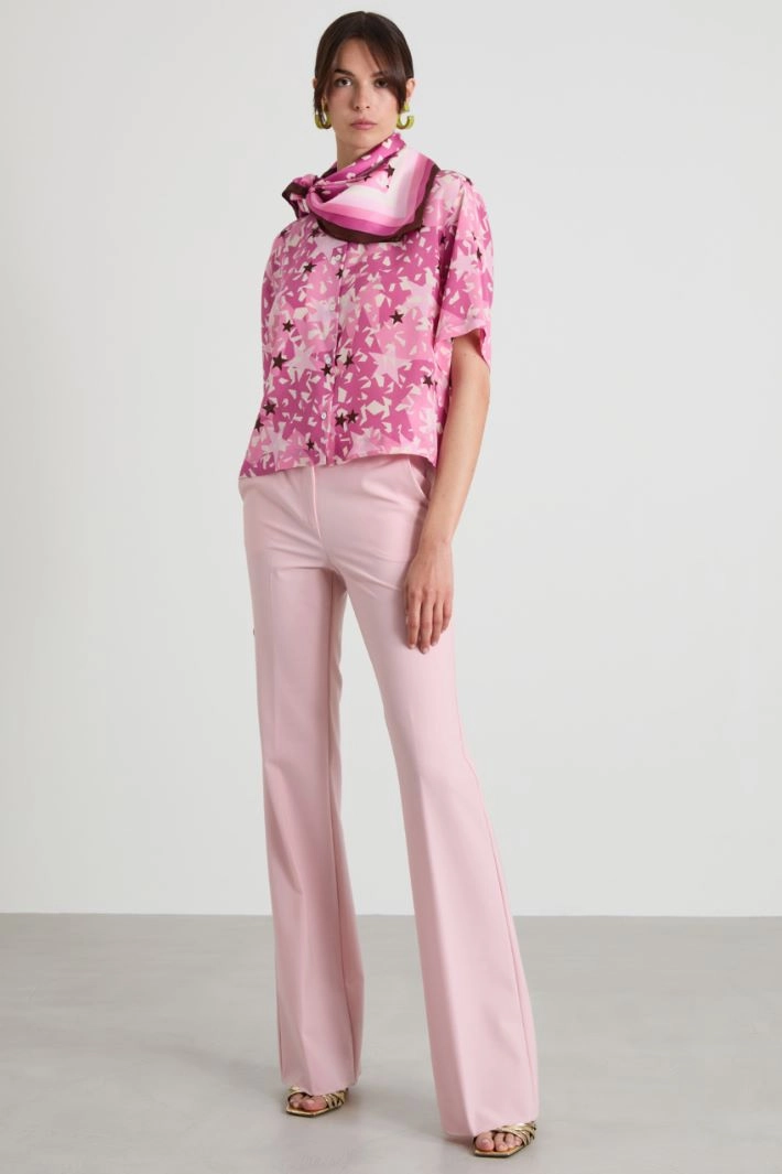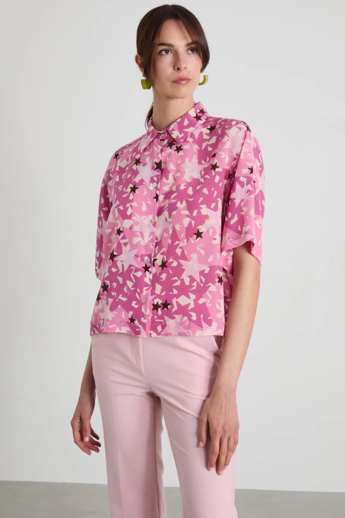 Straight-cut shirt in pure silk crepe, with a classic collar and short sleeves. Button fastening.