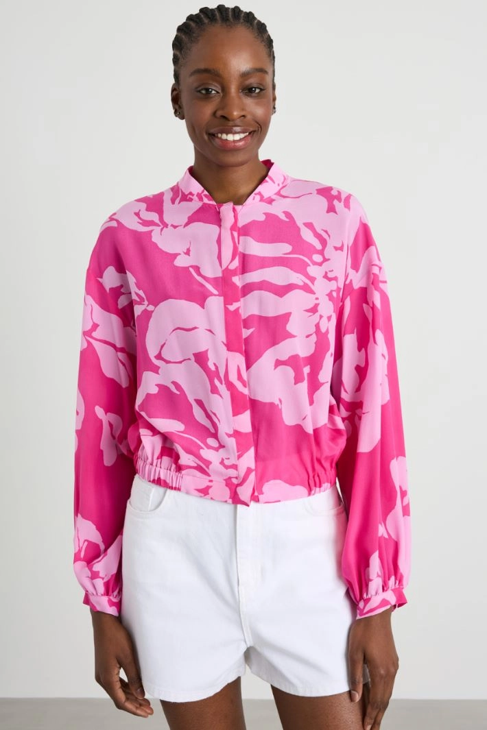 Loose-fitting shirt in pure silk crepe de chine, with bomber collar, long sleeves with cuff and button, and elastic insert at the bottom. Hidden button fastening.