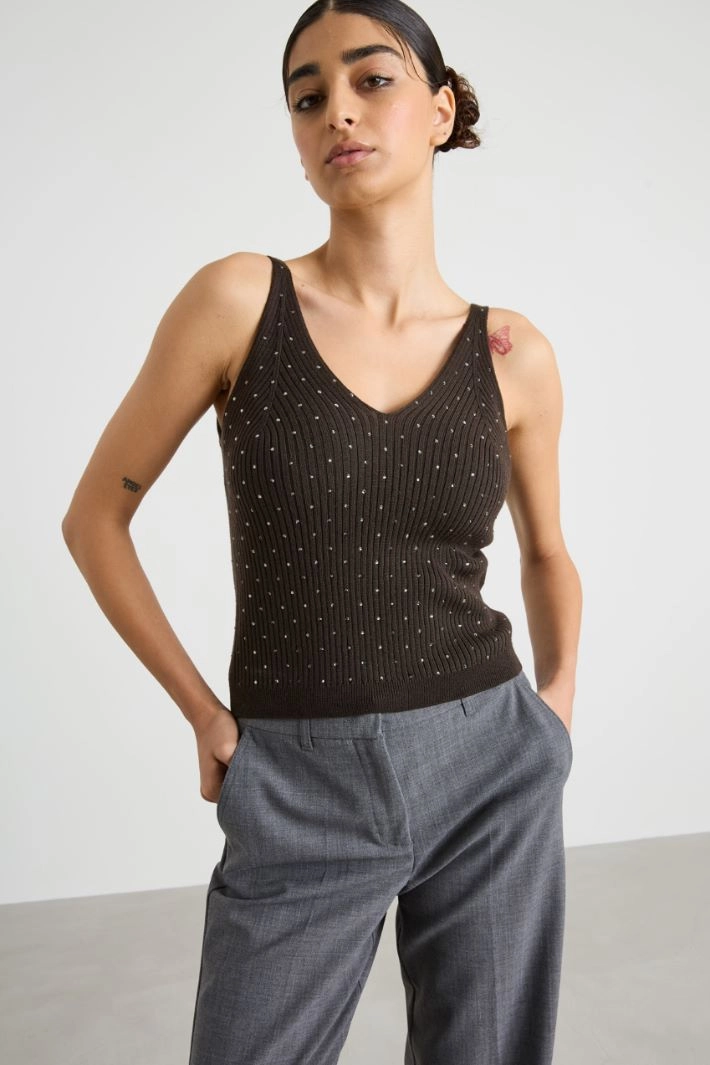 Fitted top in pure wool yarn with all-over rhinestones, V-neck and thin shoulder straps.