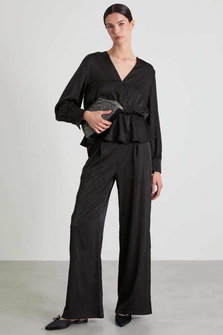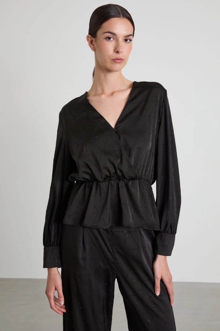 Loose-fit blouse in shiny envers satin with rhinestones applied all over, crossed V-neck, elasticated insert at the waist, long sleeves with cuff and button.