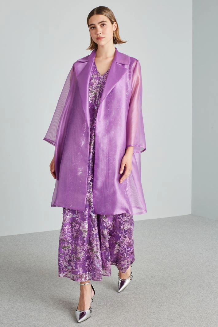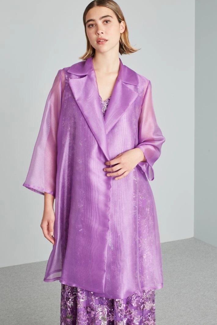 Loose fit duster coat in organza with a laminated finish, with lapel collar and long sleeves. Unlined.