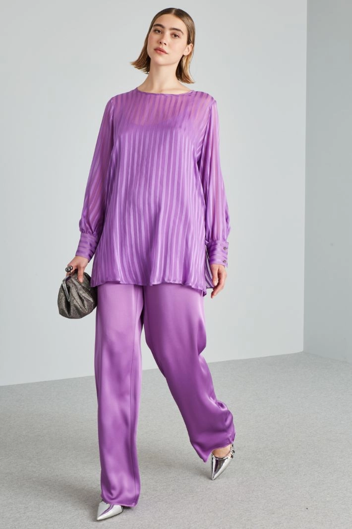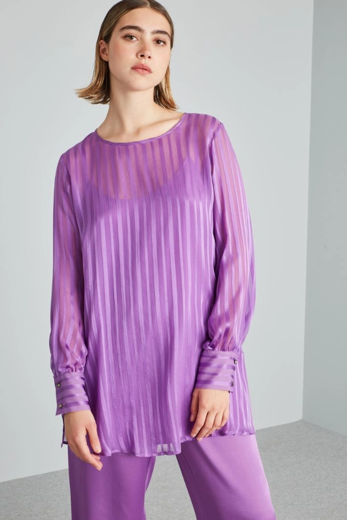 Fluid line tunic in pure silk crepon, with round neckline, long sleeves with cuff and jewel buttons, side slits and keyhole fastening with button on the back. Matching slip top.