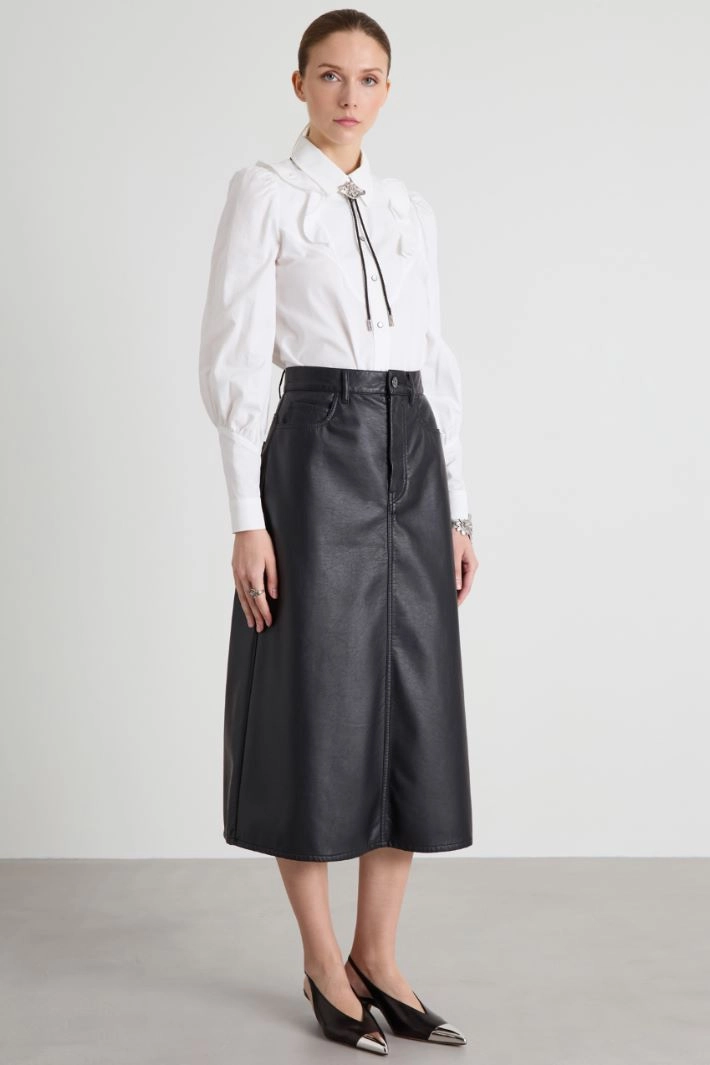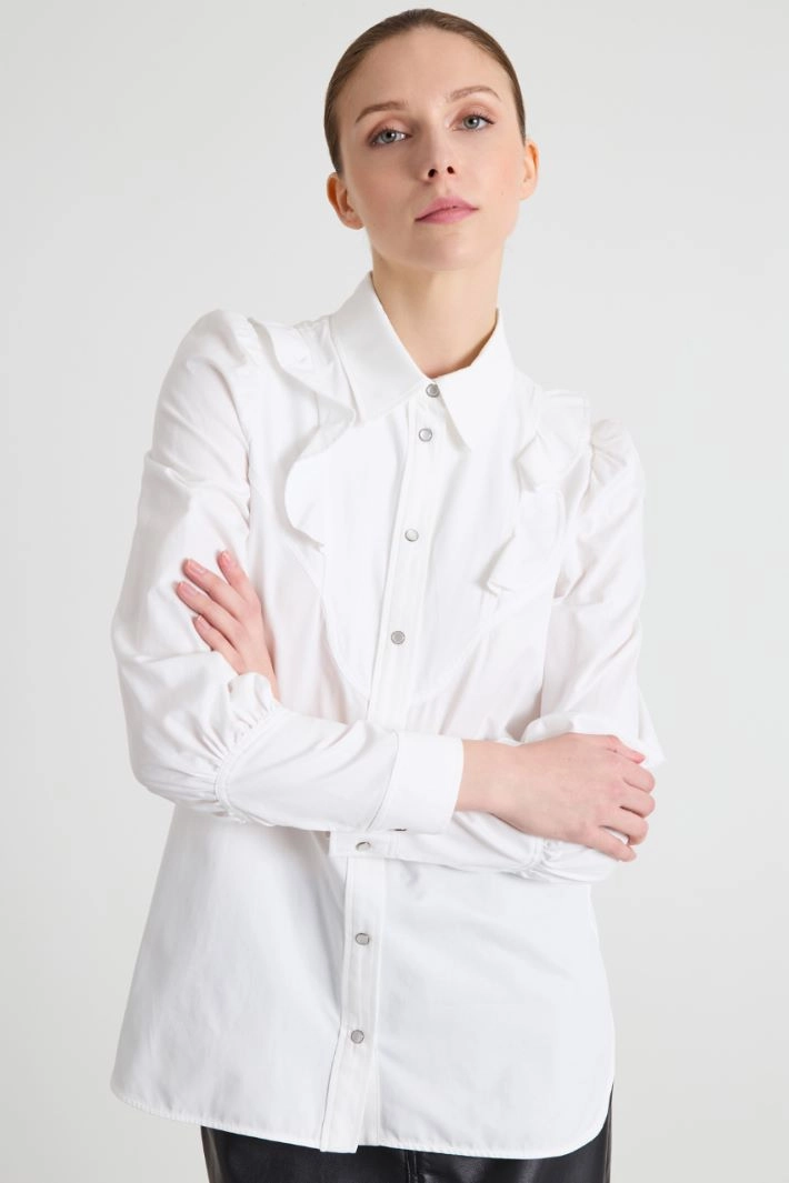 Straight-cut shirt in pure cotton twill, with classic collar, ruffle motif on the front and back, long sleeves with gathered shoulder and buttoned cuff. Fastening with mother-of-pearl effect press studs