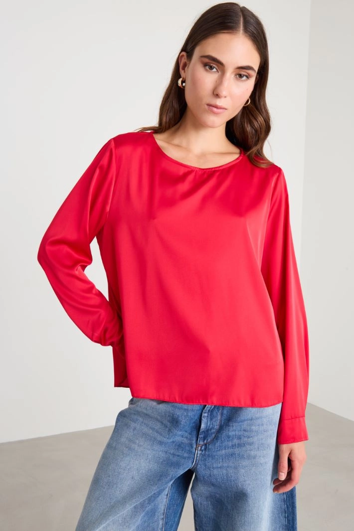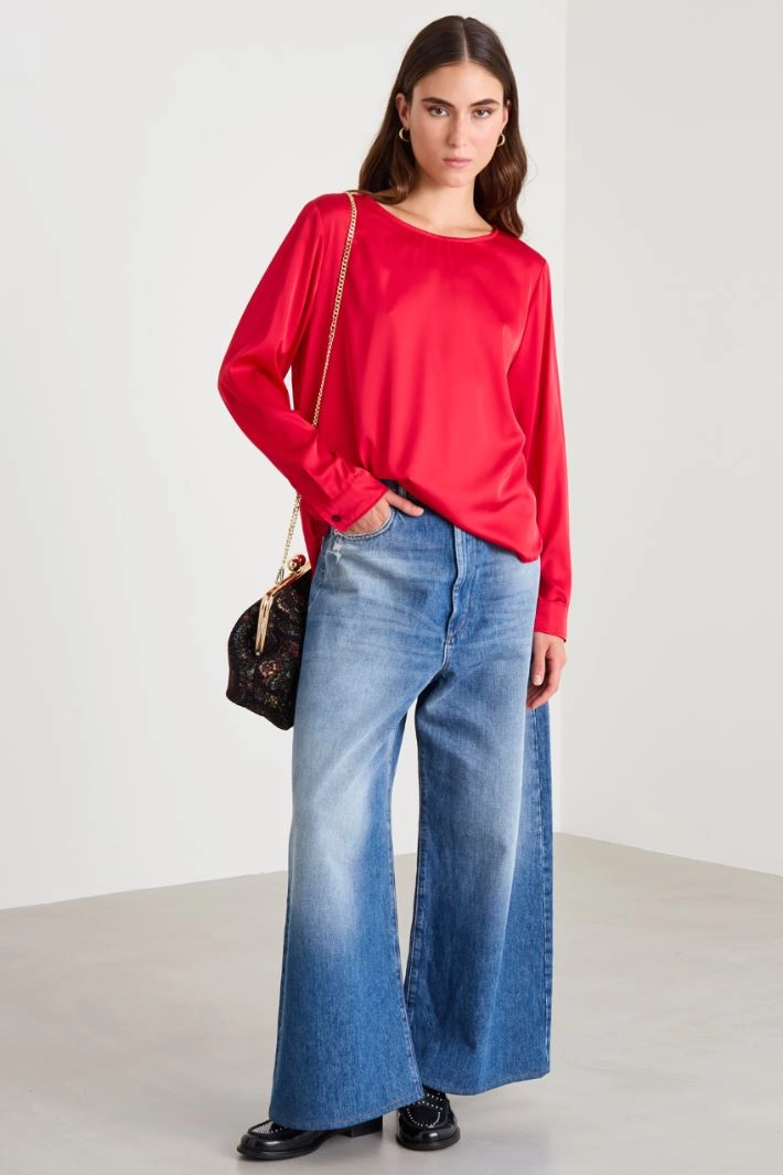 Flowing blouse in stretch satin, with round neckline and long sleeves with cuff and button.