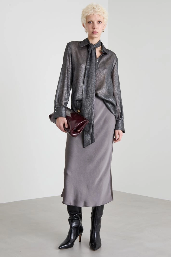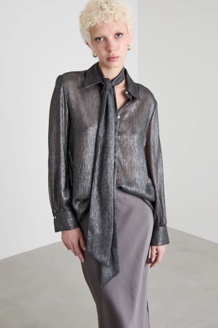 Straight-cut shirt in lamé crepon with a matching removable sash, classic collar, long sleeves with cuffs and jewel buttons. Concealed button fastening.