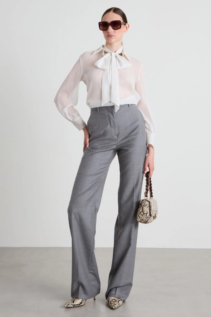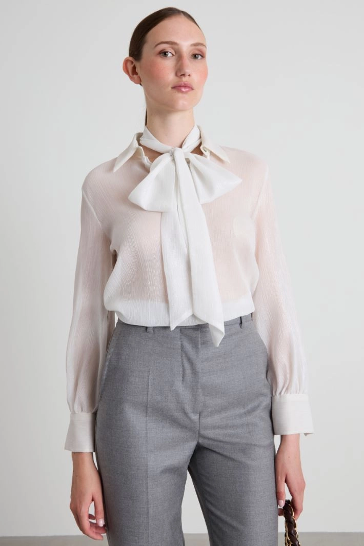 Straight-cut shirt in lamé crepon with a matching removable sash, classic collar, long sleeves with cuffs and jewel buttons. Concealed button fastening.