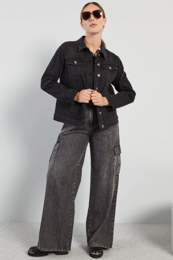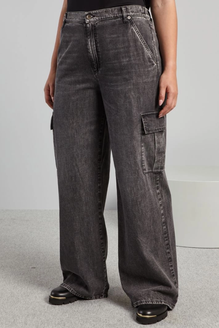 Cargo-style jeans with a wide, straight fit in fluid pure cotton denim, with elastic insert and belt loops at the waist, slant pockets on the front, patch pockets on the back and patch pockets along the leg. Hidden zip and metal button fastening.