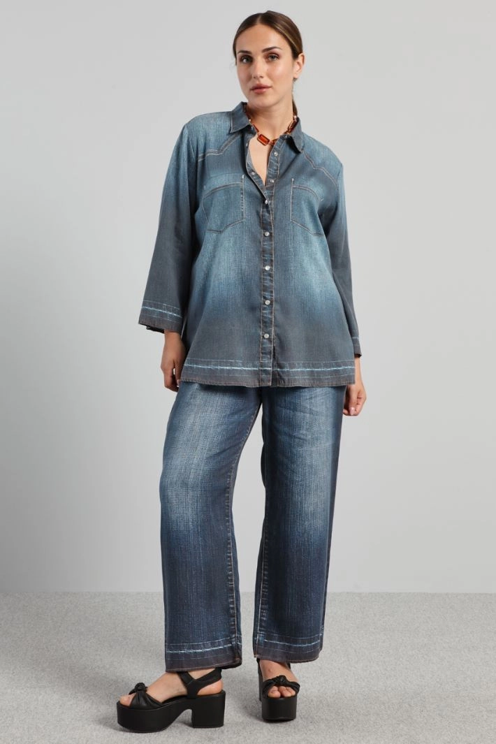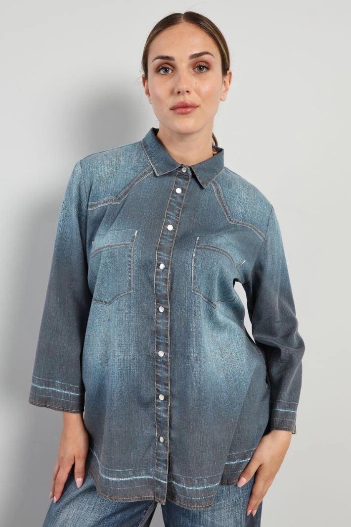 Straight-cut shirt in fluid denim-effect printed fabric, with classic collar, long sleeves and fastening with snap buttons.
