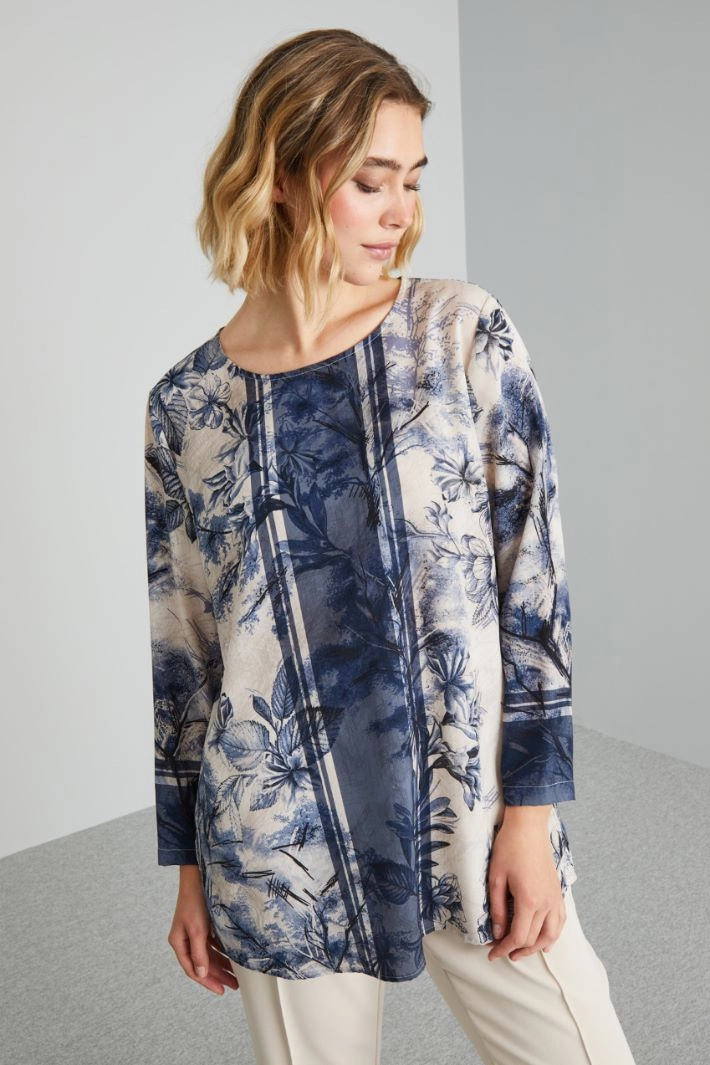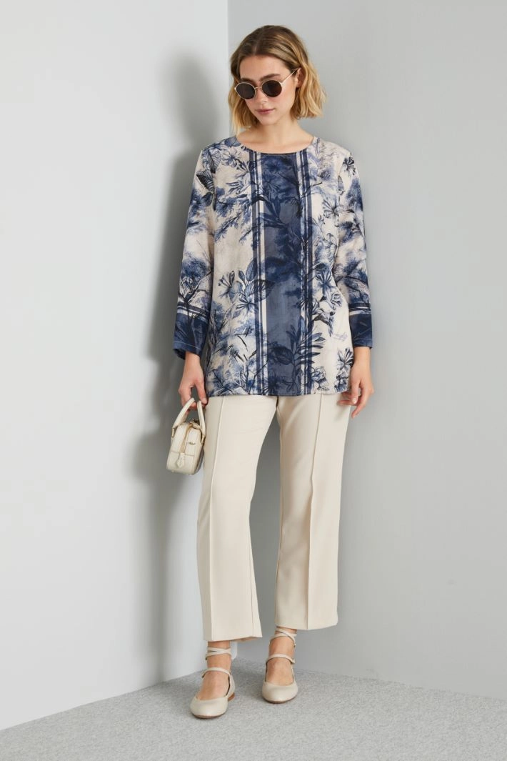Fluid blouse in printed crepe de chine, with round neckline, long sleeves and side slits at the hem.