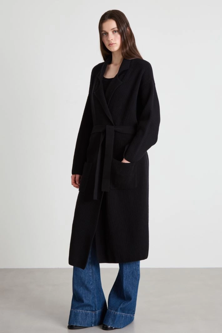 Long, loose-fit cardigan in pure wool yarn, with ribbed knit, lapel collar, long dropped sleeves, side patch pockets and matching belt fastening.