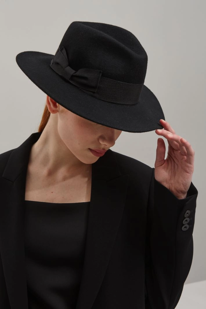 Fedora made of pure wool felt, with wide brim, grosgrain ribbon detail with bow.
