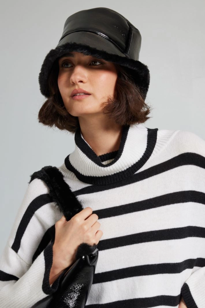 Bucket hat in sheepskin effect fabric with a patent finish.