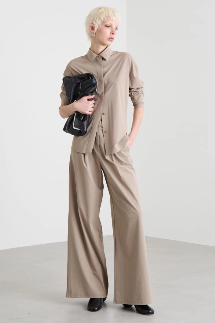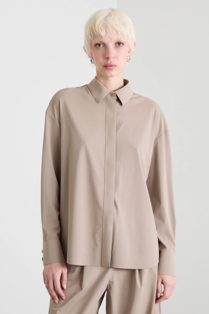 Straight-cut shirt in stretch technical jersey, with classic collar, long dropped-shoulder sleeves with cuffs and buttons, yoke at the back and hidden button fastening.
