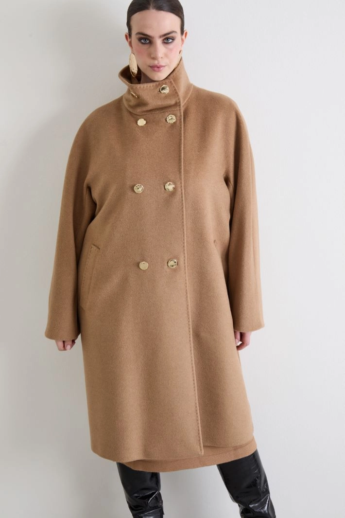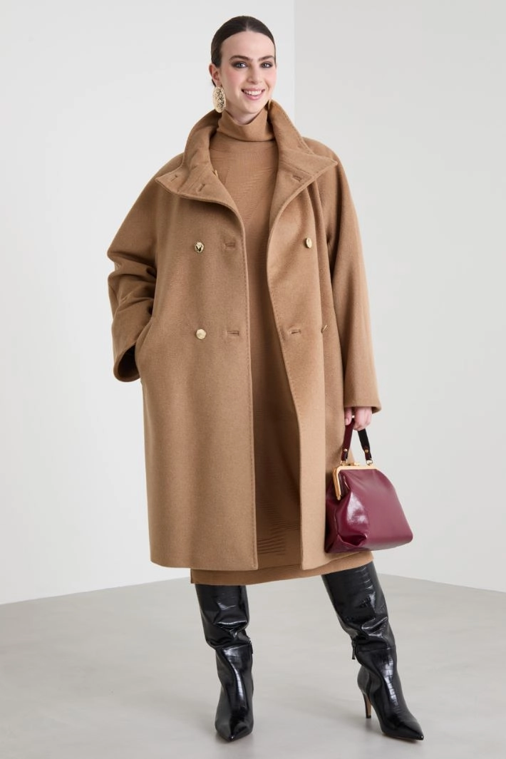 Straight-fit coat in pure wool sable drap, with topstitching, high collar, long sleeves and side welt pockets. Double-breasted fastening with metal buttons. Lined.