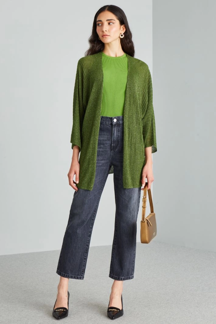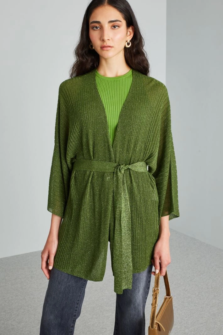 Loose-fitting cardigan in viscose blend yarn, with ribbing, lamé fiber insert, three-quarter kimono sleeves and side slits at the hem. Fastening with matching belt.