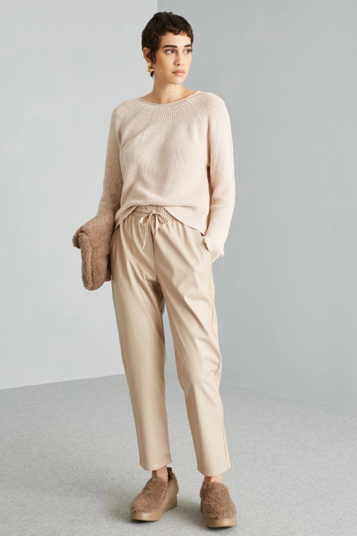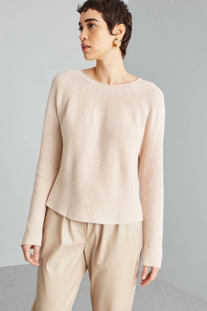 Straight-fit ribbed sweater in cotton yarn and natural fiber, with boat neckline with rolled profile, long raglan sleeves and ribbed edges.