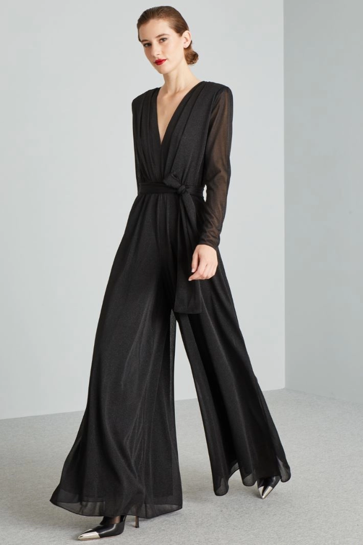 Loose-fit jumpsuit in lamé jersey, with deep V-neck, sewn pleats on the shoulders, padded shoulder straps, long sleeves and elastic insert at the waist. Matching sash. Partially-lined.