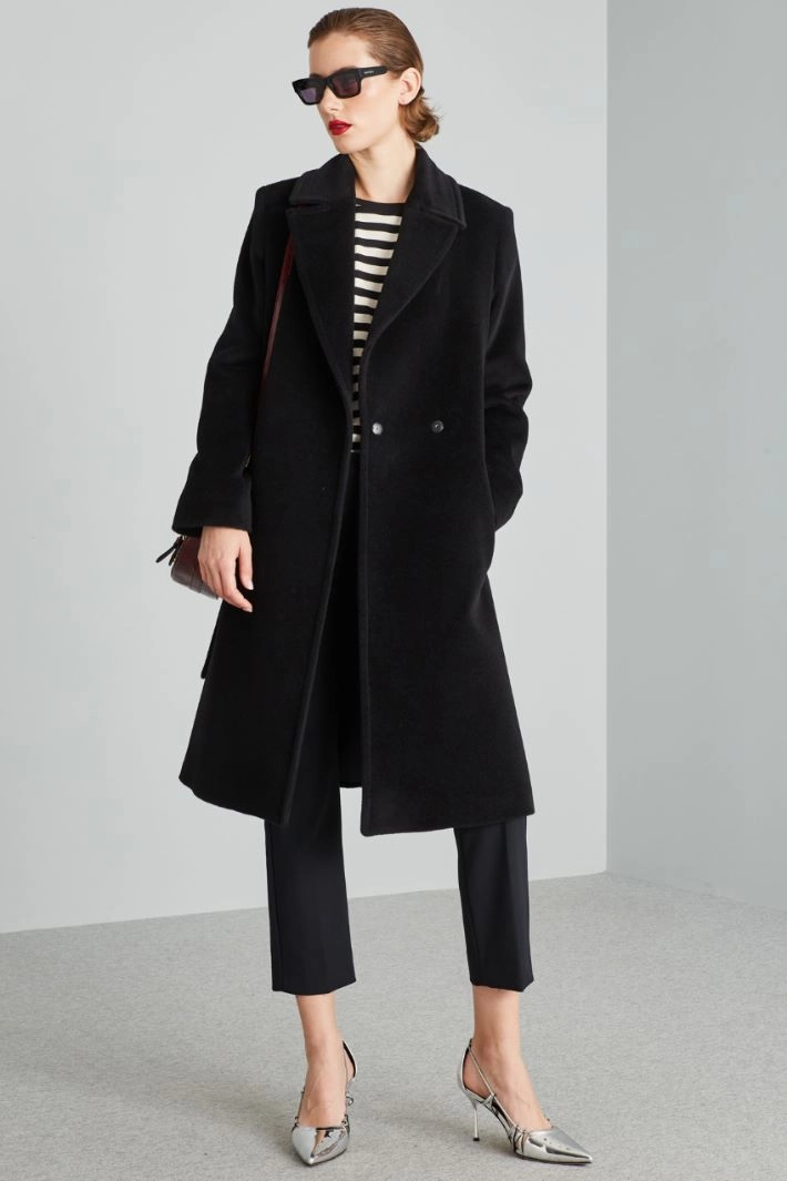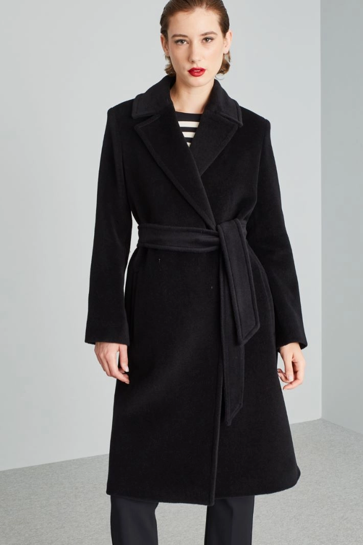 Straight-fit coat in pure wool beaver, with lapel collar, long sleeves, welt pockets and double-breasted fastening hidden with snap buttons and matching belt. Lined.