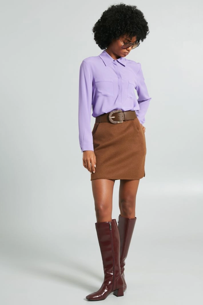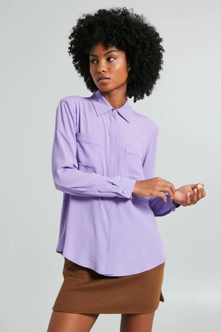 Fluid shirt in silk blend crepe de chine with classic collar, long sleeves with cuff and button, patch pockets on the chest and yoke cut with double pleat sewn on the back. Hidden button fastening on the front.