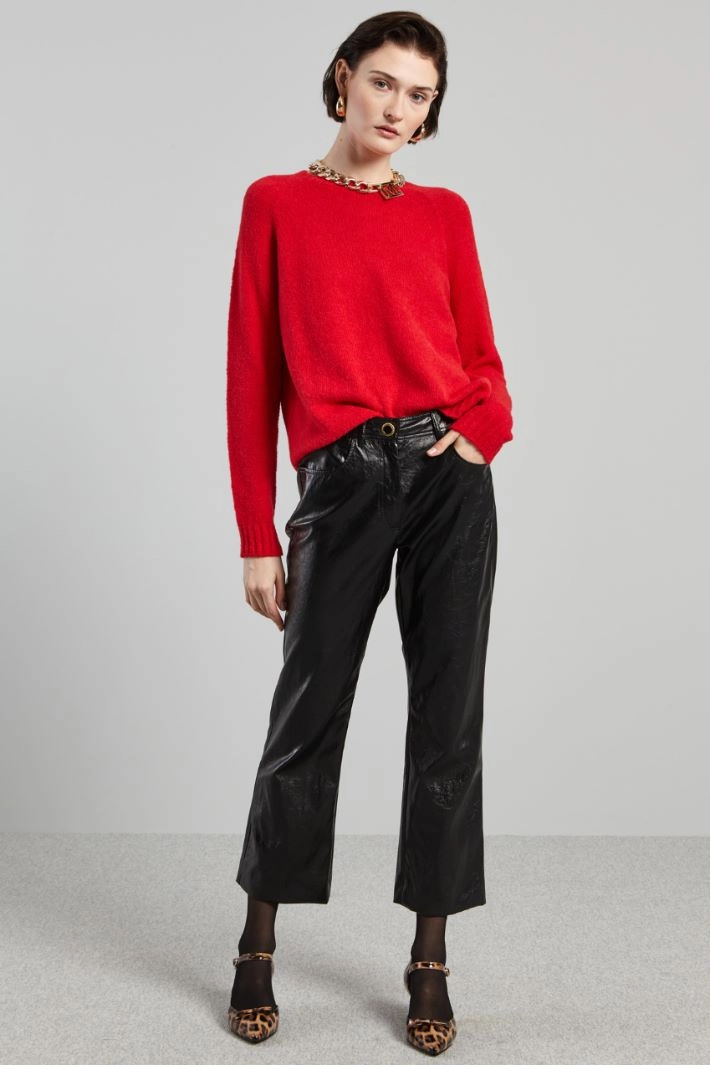 Cropped trousers with a slightly flared hem in leather-effect coated fabric, with belt and belt loops at the waist, French pockets on the front and patch pockets on the back. Hidden zip and metal button fastening.