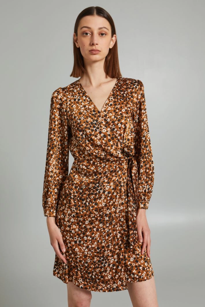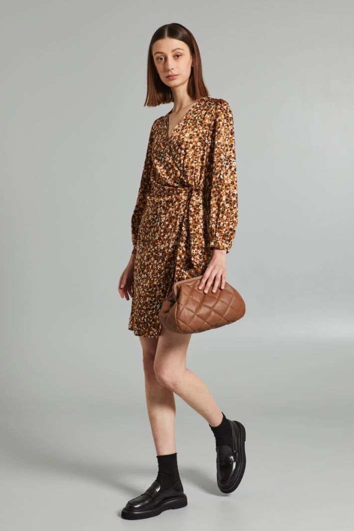 Semi-fitted short dress in printed fabric featuring a wrap-style side-tie fastening. Crossover V-neckline and long cuffed sleeves. Elasticated rear waistband.
