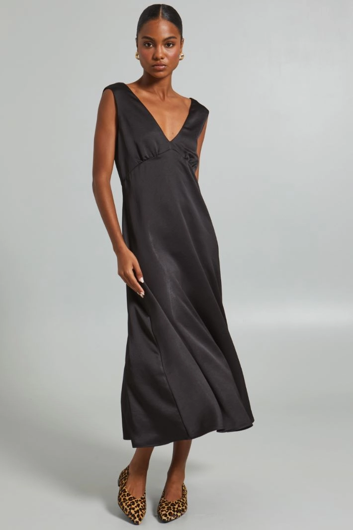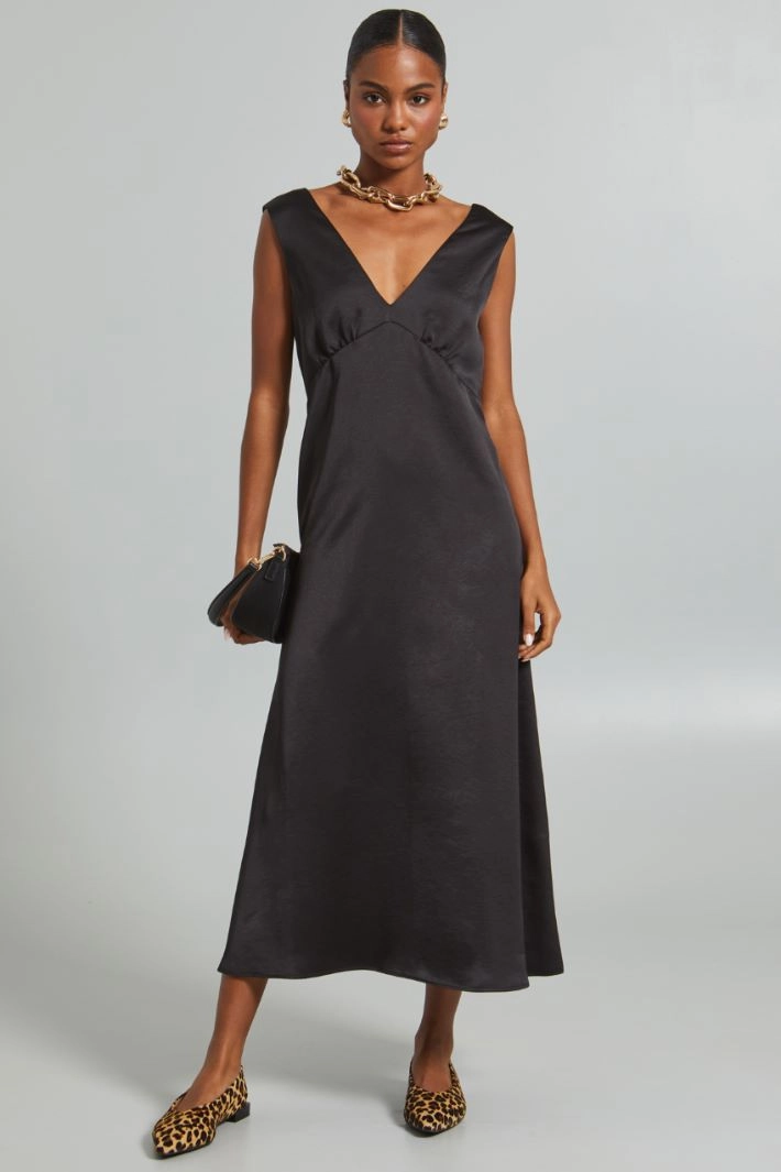 Flared sleeveless satin dress with V-neck on the front and back, asymmetrical cut under the bust and invisible zip fastening on the side. Partially-lined.