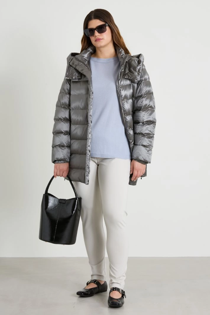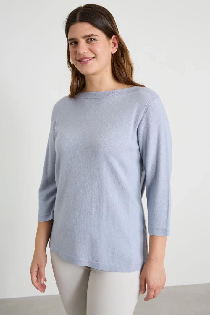 Straight-cut sweater in lightweight pure wool yarn, with a boat neckline and three-quarter sleeves.