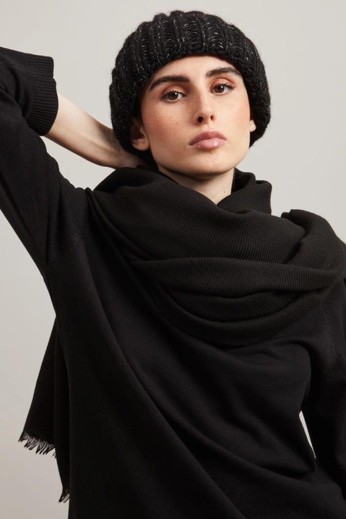 Beanie hat in wool, alpaca and viscose blend ribbed knit, with lurex yarn insert and turned-up bottom.